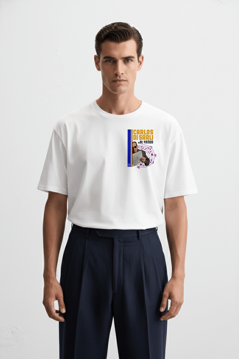 €45.00100% combed cotton T shirt inspired by the tango culture and its characters. The DTG prints were designed by our creative director, after a deep search inside the tango historical archive. In this case evokes the famous Composer/musician CARLOS DI SARLI. The Tango on me institutional prints are made with high quality standards and designed by our creative…